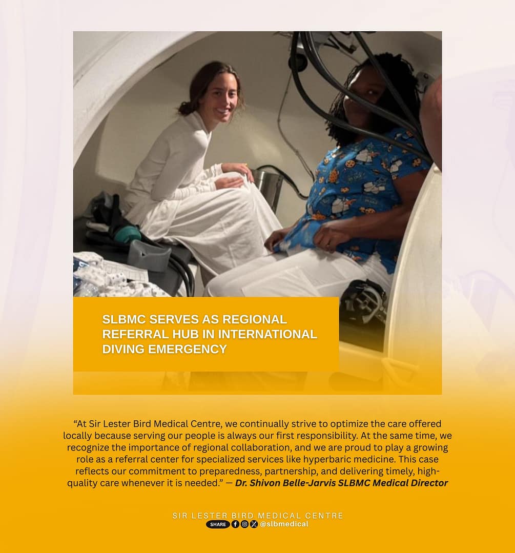 โAt Sir Lester Bird Medical Centre, we continually strive to optimize the care offered locally because serving our people is always our first responsibility. At the same time, we recognize the importance of regional collaboration, and we are proud to play a growing role as a referral center for specialized services like hyperbaric medicine. This case reflects our commitment to preparedness, partnership, and delivering timely, high-quality care whenever it is needed.โ