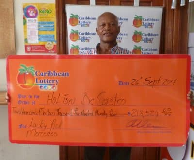 Arlene Alexander, Caribbean Lottery’s Office Manager, offered hearty congratulations to DeCastro on his big Lucky Pick win: “Caribbean Lottery is pleased to have presented DeCastro with his cheque for $213,524 and we’re delighted that he’s winning for a second time. This is a significant win and we are happy that he has big plans for his Lucky Pick win,” she enthused.