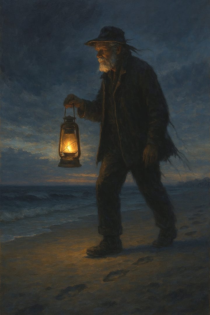 By dawn, the storm was gone. And so was the old man. Only his footprints remained in the sand… and his lantern, glowing on a driftwood stump as if to say: “The light is yours now”. From that day on, Coral Cay’s elders said Old Man Bramble was sent by the Maker, and children believed he’d come back.