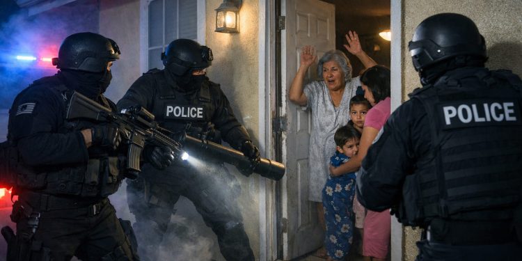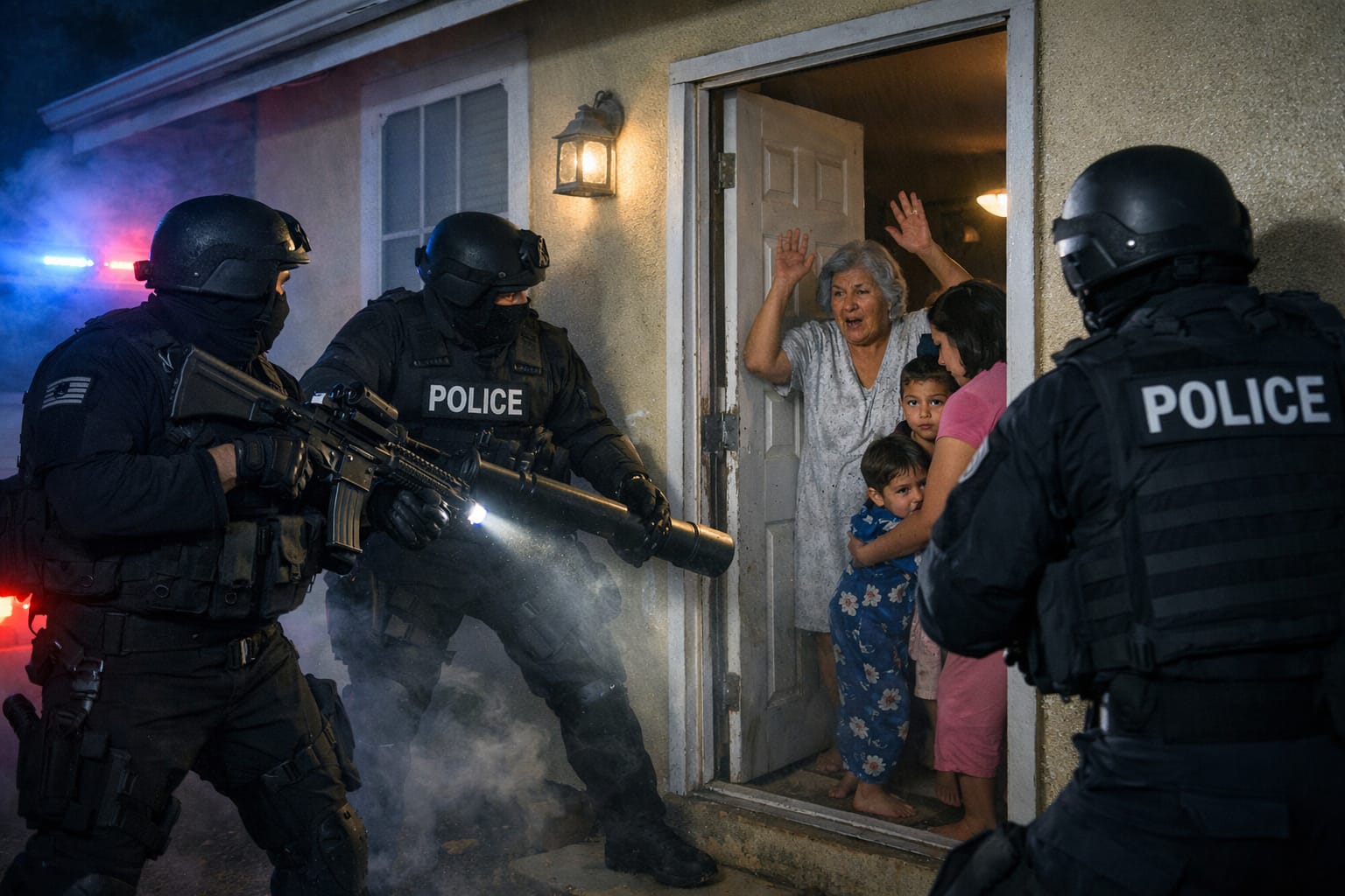 Occupants were awakened by loud commands and confronted by officers reportedly carrying military style weapons.