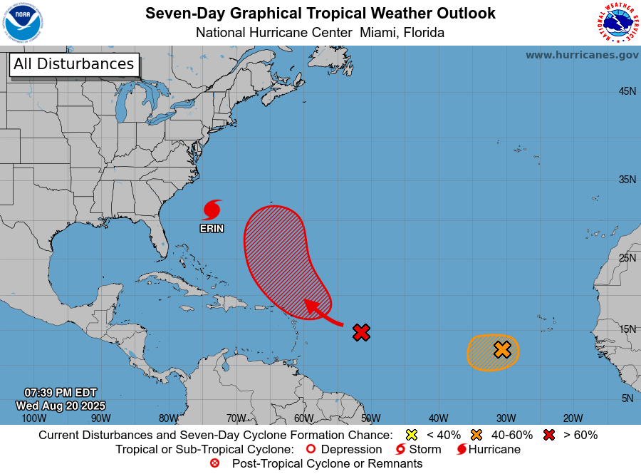 Formation chance through 7 days…high…70 percent.Disturbance 2: 40% Chance of Cyclone Formation in 7 DaysAs of 8:00 PM EDT Wed Aug 20 2025…Eastern Tropical Atlantic (AL99):
