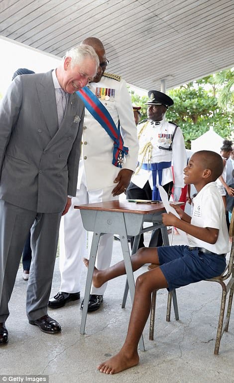 The Prince of Wales lifted the spirits of staff and pupils at a shelter in Antigua and Barbuda on the first day of his tour of the hurricane-ravaged nation.