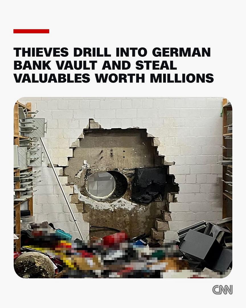 Reuters — Thieves used the quiet Christmas period to drill their way into the vault of a German retail bank and make off with at least 10 million euros’ worth of money and valuables from customers’ deposit boxes, police said on Tuesday.