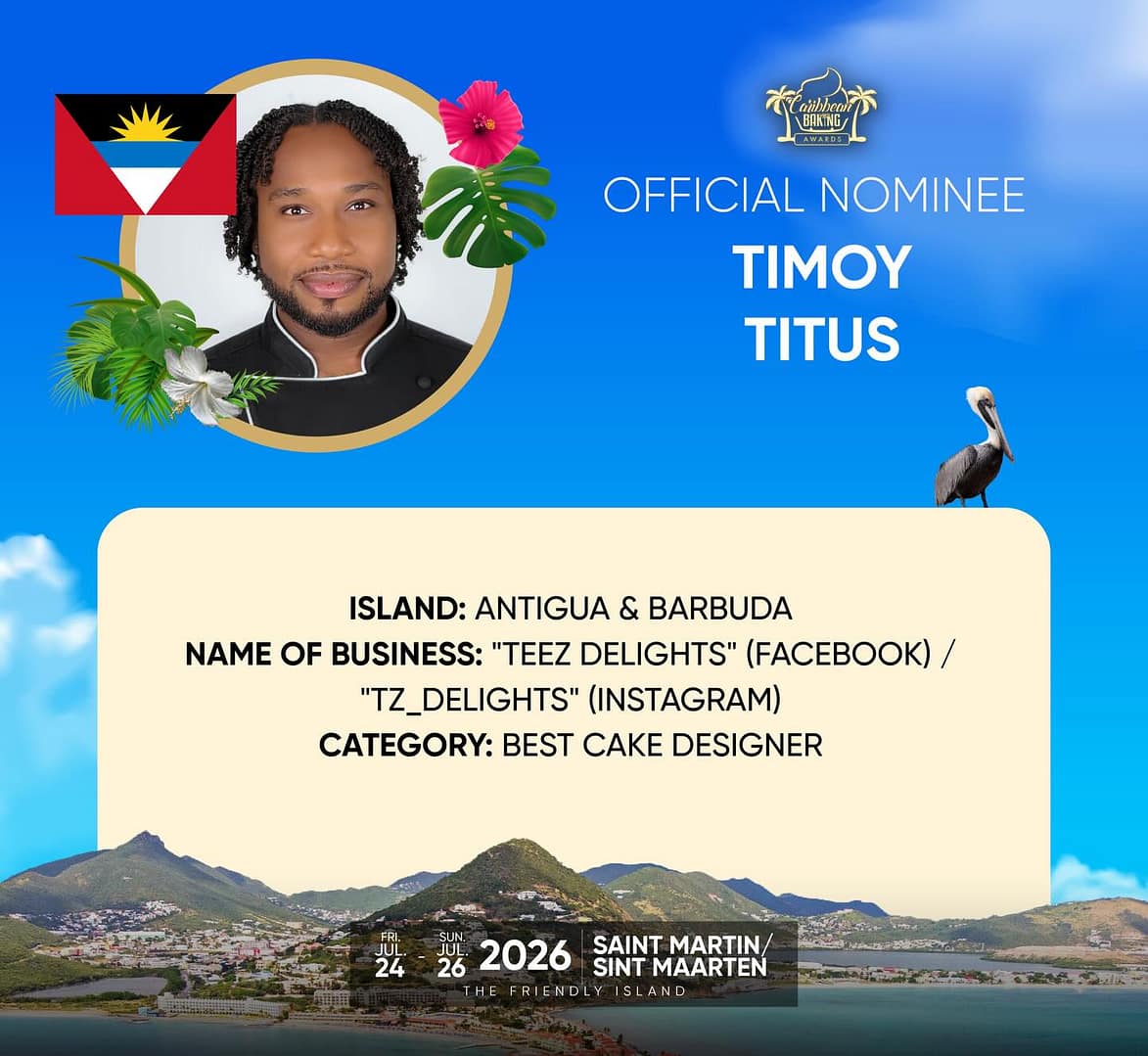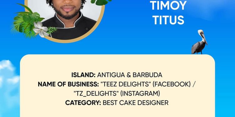 Antiguan cake designer Timoy Titus has been named an official nominee for the 2026 Caribbean Baking Awards, scheduled to take place in Saint Martin from 24–26 July 2026.