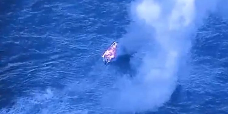 An accompanying video showed a boat speeding across the waves before being engulfed in smoke and flames, then continuing to burn while still floating.