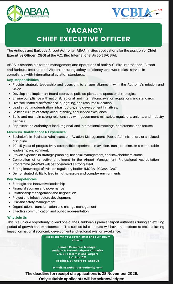The Antigua and Barbuda Airport Authority (ABAA) invites applications for the position of Chief Executive Officer (CEO) at the V.C. Bird International Airport (VCBIA).